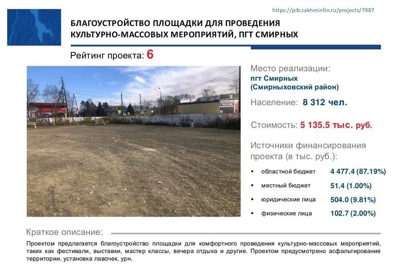 - Благоустройство площадки для проведения культурно-массовых мероприятий, пгт Смирных.