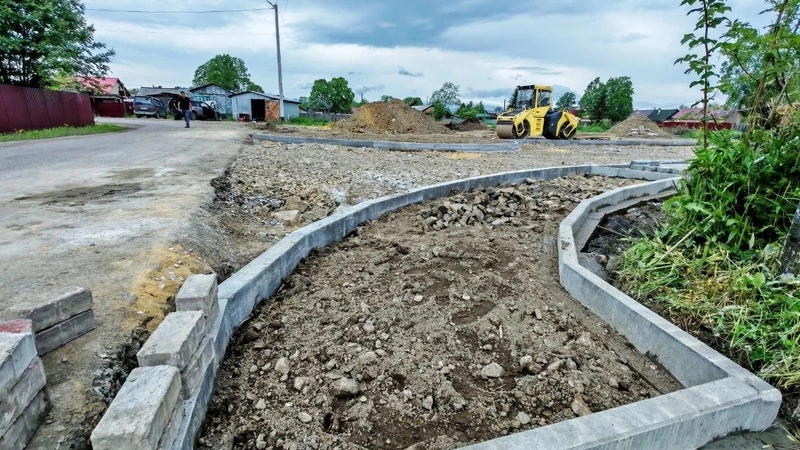 Сейчас подрядчик устанавливает бордюрный камень, готовит основание и укладывает тротуарную плитку.