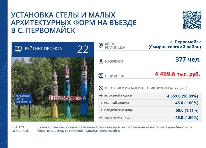 1️⃣ Установка стелы и малых архитектурных форм на въезде в с. Первомайск. В рамках реализации проекта планируется на въезде в село установить на постаменте арт-объект «Три богатыря» и стелу со световой надписью «Первомайск».